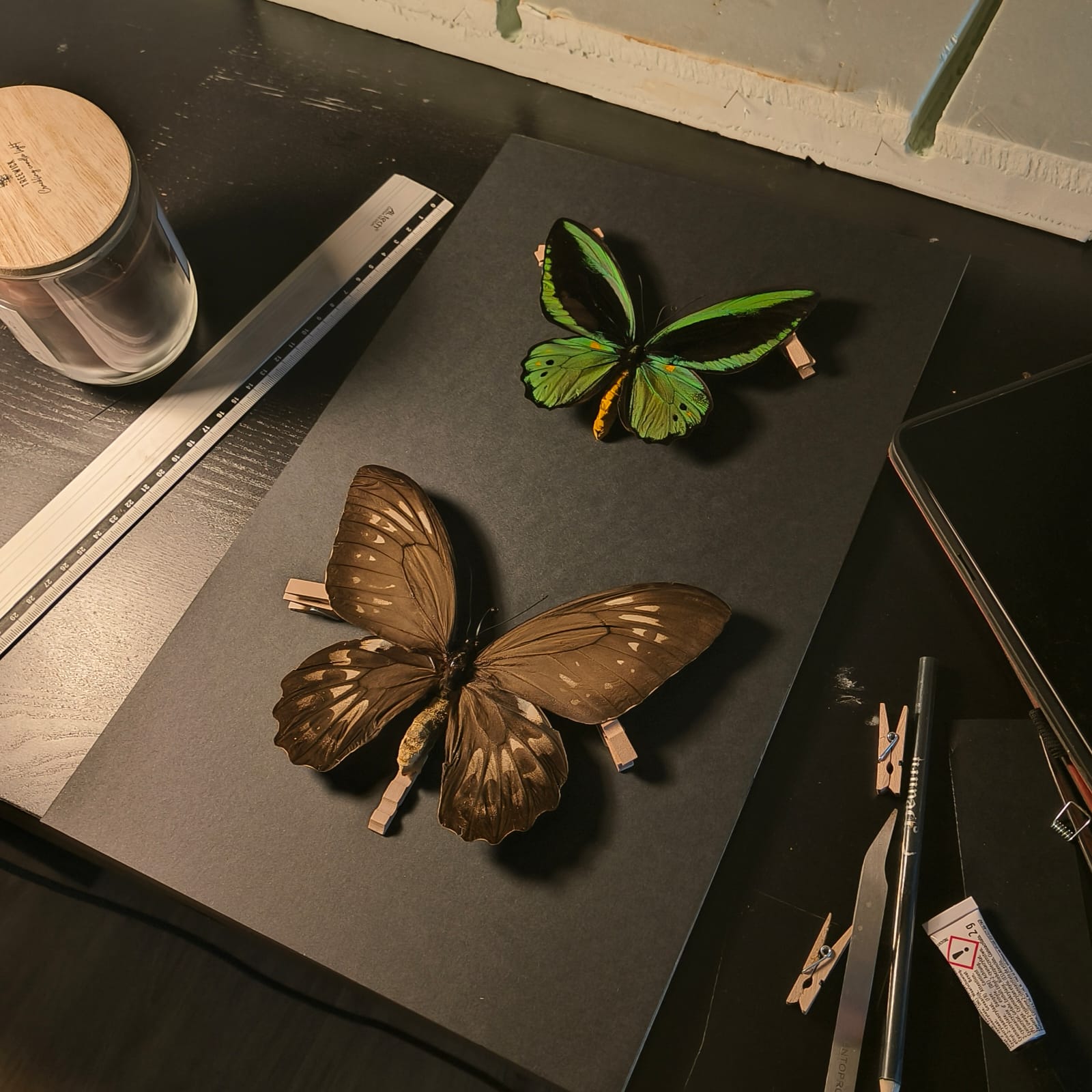 J'ai donc acheté mes premiers insectes. C'était nouveau pour moi, et j'ai dû apprendre les techniques de préparation et de conservation. J'ai pris le temps de préparer chaque spécimen avec soin : positionner les ailes correctement, respecter la symétrie, ajuster les antennes et les pattes. C'était un travail minutieux qui demandait de la patience et de la précision, mais j'y prenais beaucoup de plaisir.